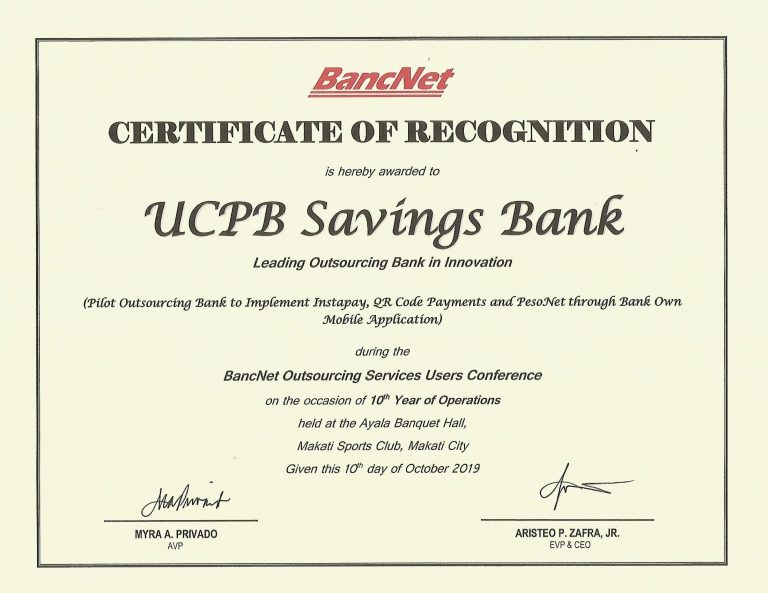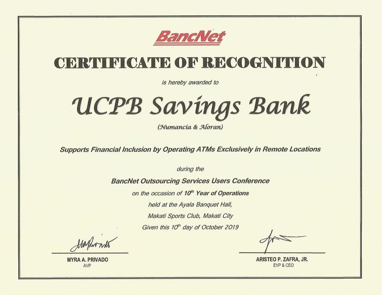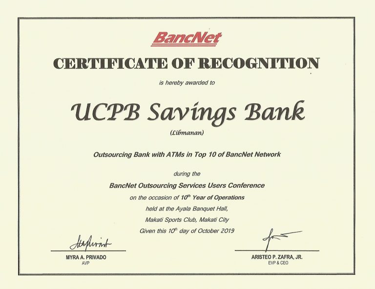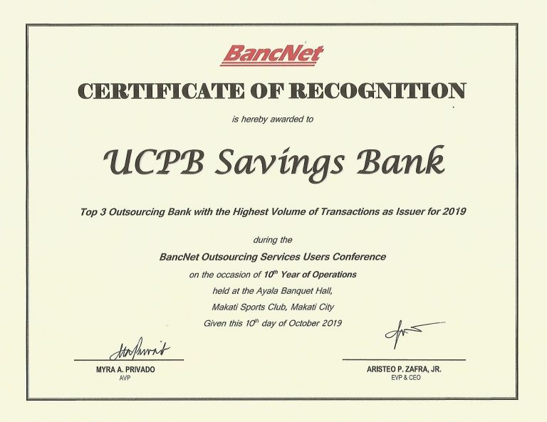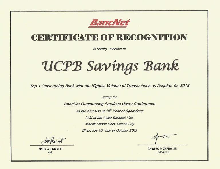 As a validation of the President and CEO’s statement, UCPB Savings Bank (USB) bagged 3 national awards and 3 branch awards during the recently concluded BancNet Outsourcing Services Users